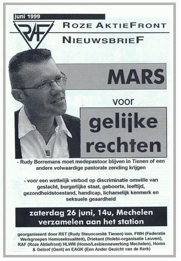 De acties rond Rudy Borremans – waarin het Roze Aktiefront een belangrijke rol speelde – bereikten een hoogtepunt met een manifestatie (‘Mars voor Gelijke Rechten’) te Mechelen in juni 1999. De verdediging van Rudy werd gekoppeld aan een andere belangrijke eis die toen nog niet was gerealiseerd: de anti-discriminatiewet.