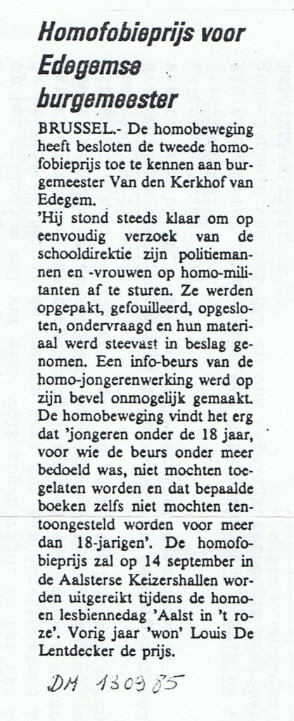 In 1985 werd de homofobieprijs toegekend aan CVP (nu CD&V-)burgemeester Van Den Kerkhof van Edegem. Uit het persbericht da toen in de krant verscheen: “Hij stond steeds klaar om op eenvoudig verzoek van de schooldirectie zijn politiemannen en -vrouwen op homomilitanten af te sturen. Ze werden opgepakt, gefouilleerd, opgesloten, ondervraagd en hun materiaal werd steevast in beslag genomen. Een infobeurs van de homojongerenwerking werd op zijn bevel onmogelijk gemaakt. De homobeweging vindt het erg dat jongeren onder de 18 jaar, voor wie de beurs ondermeer bedoeld was, niet toegelaten werden en dat bepaalde boeken zelfs niet mochten tentoongesteld worden voor meer dan 18-jarigen.”