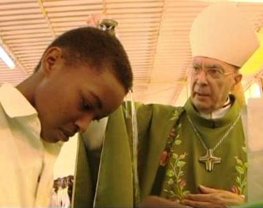 Léonard in gesprek met jonge Rwandese gelovigen. Hij wil enkel ‘sterke’ seminaristen uit Afrika opleiden