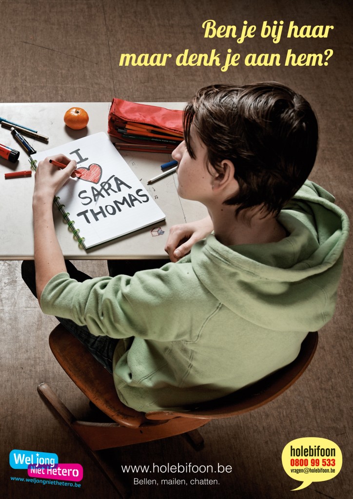 Jongeren worden steeds vroeger geconfronteerd met vragen en twijfels over hun seksuele identiteit. Wel Jong Niet Hetero (de nationale jeugdbeweging voor holebi’s en transgenders in Vlaanderen) wordt de laatste jaren overspoeld door verhalen van jongeren. Ook de Holebifoon (de info- en hulplijn voor iedereen met vragen over het holebithema) merkt een trend van steeds jongere bellers en chatters. Uit hun verhalen blijkt een grote en dringende nood om dit thema op school bespreekbaar te maken. De twee campagnebeelden tonen een meisje en een jongen op de schoolbanken, die nadenken over verliefdheid maar in de war zijn over hun seksuele identiteit. “Ben je bij hem maar denk je aan haar?” en “Ben je bij haar maar denk je aan hem?” geeft die twijfel weer. De posters kunnen apart of samen uitgehangen worden.