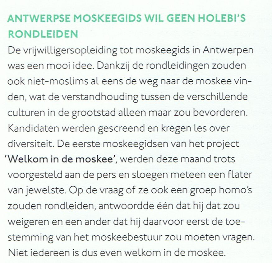 Sedert 11 september zijn moslims zondebok nummer één. De homofobie bij moslims wordt uitvergroot. Dat gebeurt niet enkel in deze zaak. De Standaard bracht een stuk over de Antwerpse moskeegidsen waarin de feiten compleet verdraaid werden.