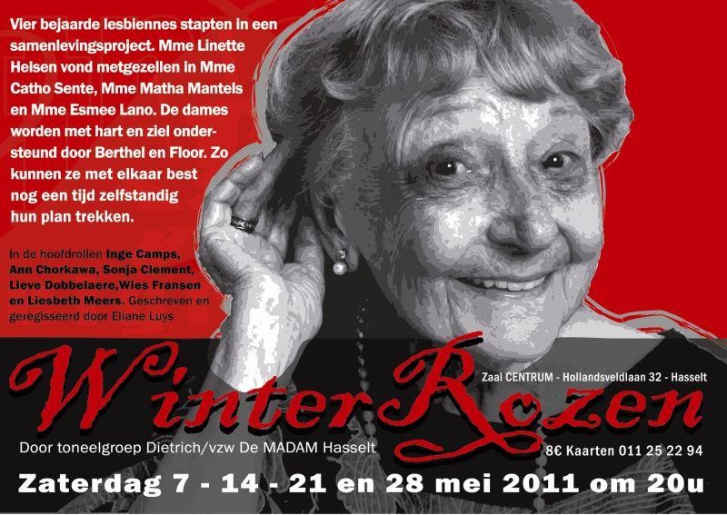 Toneel over holebisenioren, bestaat dat? Jawel, in Hasselt! ‘Winterrozen’ is een voorstelling van toneelkring Dietrich met de nodige dosis drama, humor, vreugde en verdriet, uit het lesbisch leven gegrepen.