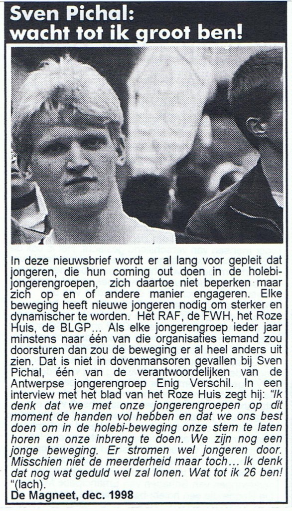 Sven Pichal, een van de wonderboys uit de eerste generatie jongeren die in het veilige nest van WJNH mochten opgroeien reageerde in De Magneet, het blad van Het Roze Huis: “Ik denk dat we met onze jongerengroepen op dit moment de handen vol hebben en dat we ons best doen om in de holebi-beweging onze stem te laten horen en onze inbreng te doen. We zijn nog een jonge beweging. Er stromen wel jongeren door. Misschien niet de meerderheid maar toch… Ik denk dat nog wat geduld wel zal lonen. Wacht tot ik 26 ben!”