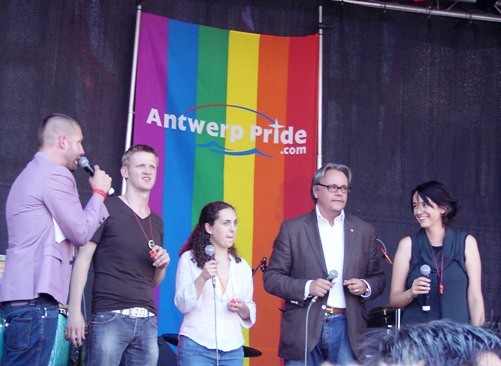 Zondag 26 juni. Slotmanifestatie van de Antwerp Pride op de grote markt. Het is een drukke week geweest voor de holebitransgenderbeweging. Het feestgedruis werd verstoord door het bericht dat een homo in mekaar getimmerd werd in het hartje van Brussel.
