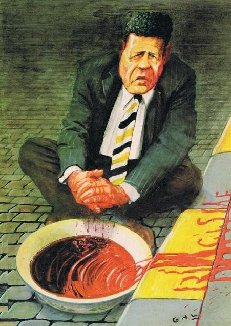 We hebben al meer gekken zien passeren: de De man die Mohamed Achrak in 2002 in Borgerhout neerschoot werd ontoerekeningsvatbaar verklaard. En ook bij Hans Van Temsche, die op 11 mei 2006 in Antwerpen op straat de zwangere Malinese vrouw Oulematou Niangadou en het tweejarig meisje Luna Drowart neerknalde kreeg een psychiatrisch profiel aangemeten. Toemalig VB-voorzitter Frank Vanhecke waste ook de handen in onschuld, wat cartoonist GAL tot bovenstaande prent inspireerde. Gerechtspsychiater Roger Deberdt maakte een andere analyse: “Van Themsche vertoefde in een milieu waar vreemdelingenhaat mogelijk niet ongewoon was. Dat heeft geleid tot een chronische intoxicatie over een langere periode, waardoor hij zich ging identificeren met neonazi’s, tot in zijn kleding toe. Hij is zeker niet van het ene moment op het andere doorgeslagen.” Het VB mag dan nog zo hard roepen dat ze niets met de Noorse terrorist te maken hebben, de politieke verwantschap is er overduidelijk. In zijn manifest verwijst Breivik meermaals naar Vlaams Belang en Filip Dewinter. Zo heeft hij het op bepaald moment bijvoorbeeld over “Dewinter, mezelf en alle anderen die niet geloven in de mythe van een gematigde islam”.