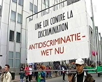 Het activisme dat door de Rooie Vlinder groeide en bloeide werd door het RAF verdergezet. Over de eerste tien jaar kan je de krachtlijnen nalezen op deze blog. De beweging in haar geheel kende een terugval: interne conflicten dreigden de bovenhand te krijgen en half jaren ’80 kwam daar nog de aidsepidemie bovenop. 1990 werd het jaar waarop we lieten zien dat we onze slagkracht terugvonden. De eerste Roze Zaterdag vond plaats in Antwerpen, toevallig ook op 5 mei. De PVDA liep mee als enige politieke partij. Alleen de jongsocialisten (nu Animo) waren ook aanwezig met een delegatie. We krijgen ook logistieke steun: we mogen de geluidsinstallatie van de PVDA gebruiken. Dat soort materiële hulp kwam ook uitstekend van pas in 1997, toen de organisatoren van de Roze Zaterdag (die intussen was omgedoopt de de Pride) beslisten om de tien punten van het eisenplatform op reuzengrote spandoeken (foto) door de straten van Brussel te dragen. We mochten de tien draagbedden van de PVDA lenen voor een prikje.