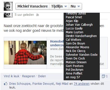 Hun blijdschap is begrijpelijk wegens de reëele dreiging van homofoob geweld die hen bezighoudt. Maar ze moeten beseffen dat het op de spits drijven van een conflict nooit goed afloopt. Of denken ze dat de allochtone gemeenschap na dit voorval meer bereidheid zal tonen om met de LHBT-beweging in gesprek te gaan over homofobie en seksisme? Bovendien maken die 75 likers zich schuldig aan wat ze de allochtone jongeren zelf verwijten: een soort van primitief groepsgedrag waarbij iedereen achter de persoon aanloopt die het meeste lawaai maakt. Dit is een sfeertje van ‘oog om oog, tand om tand’. De bende van provocateur Michiel… Wat is de volgende stap? Met z’n 75 naar Borgerhout afzakken om een partijtje te gaan knokken met 13-jarigen?