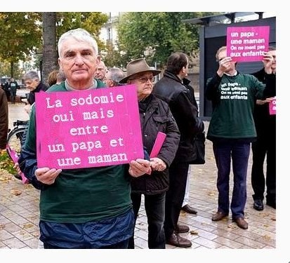 De Franse president Hollande heeft een comfortabele meerderheid om de wetswijziging erdoor te krijgen. Maar laten we het vel van de beer niet verkopen voor hij geschoten is. Dergelijke manifestaties leggen bepaalde dingen bloot. En dan heb ik het niet over deze meneer die vindt dat anale seks (‘sodomie‘) moet kunnen, maar dan enkel tussen man en vrouw. Meneer steekt hem er graag langs achter in en heel Parijs mag dat weten.