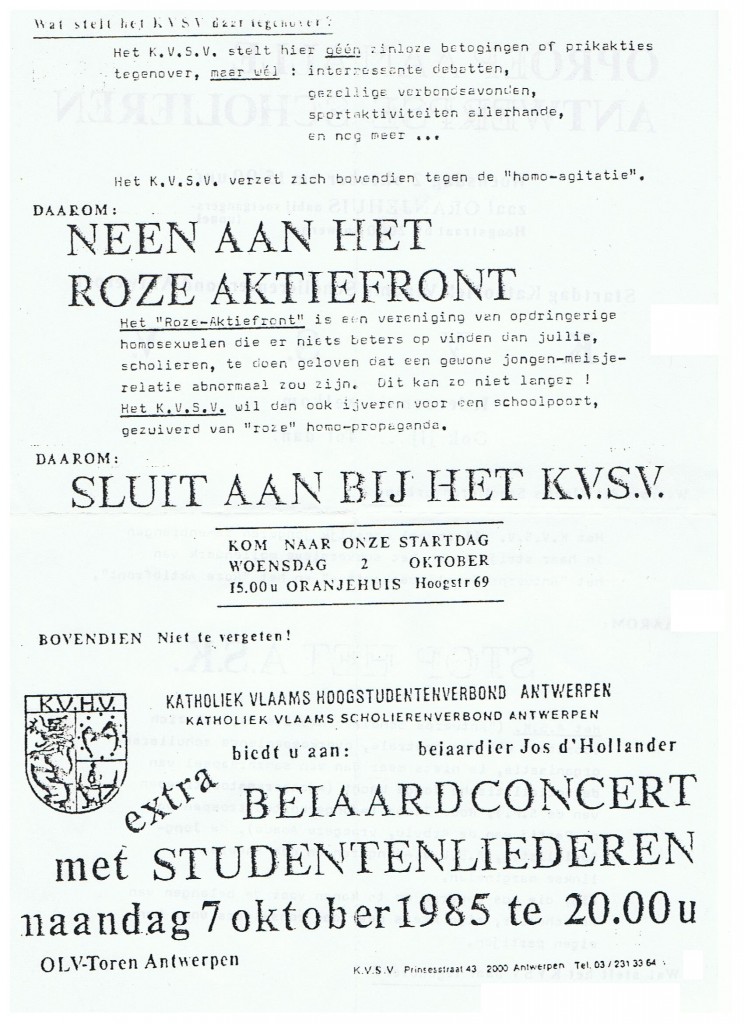 Interessant om te horen dat de homofobie van het KVHV nog niet echt afgenomen is. In de jaren ’80 was het verbond wel een stuk agressiever. Ik vond in mijn archief een pamflet van oktober 1985 waarin ze het Roze Aktiefront (RAF) aanvallen: “Het “Roze-Aktiefront” is een vereniging van opdringerige homosexuelen die er niets beters op vinden dan jullie, scholieren, te doen geloven dat een gewone jongen-meisje-relatie abnormaal zou zijn. Dit kan zo niet langer! Het K.V.S.V. wil dan ook ijveren voor een schoolpoort, gezuiverd van “roze” homo-propaganda.” Het KVSV (Katholiek Vlaams Scholierenverbond) was het kleine broertje van het KVHV. Dat jaar werd het RAF aangevallen door een knokploeg van het Vlaams Belang aan het college van Edegem. Het RAF voerde toen een campagne met flyers aan de schoolpoorten, in die tijd zowat de enige manier om scholieren te bereiken. Jongerengroepen bestonden nog niet en scholenwerkingen waren er nauwelijks. Hans Soetaert, die in de jaren ’90 het prille Verkeerd Geparkeerd leidde, schreef toen: “Ik heb het RAF leren kennen toen ik nog op het college zat en daar folders werden uitgedeeld aan de schoolingang. Maar ik deed daar niks mee. (…) Maar, het moet gezegd, het RAF was er, in die woestenij van niks. Daar mogen ze trots op zijn.”