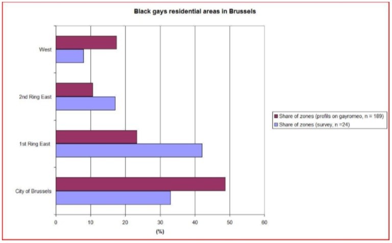 Les données récoltées par le questionnaire et par GayRomeo concernant les lieux de résidence ont été représentées en les comptabilisant par groupe de communes. On distingue l’Ouest de Bruxelles (Jette, Ganshoren, Koekelberg, Berchem Sainte-Agathe, Molenbeek Saint-Jean et Anderlecht), Bruxelles-ville, les communes de première couronne orientale (Evere, Schaerbeek, Etterbeek, Ixelles, Saint-Gilles et Forest), et les communes de seconde couronne orientale.