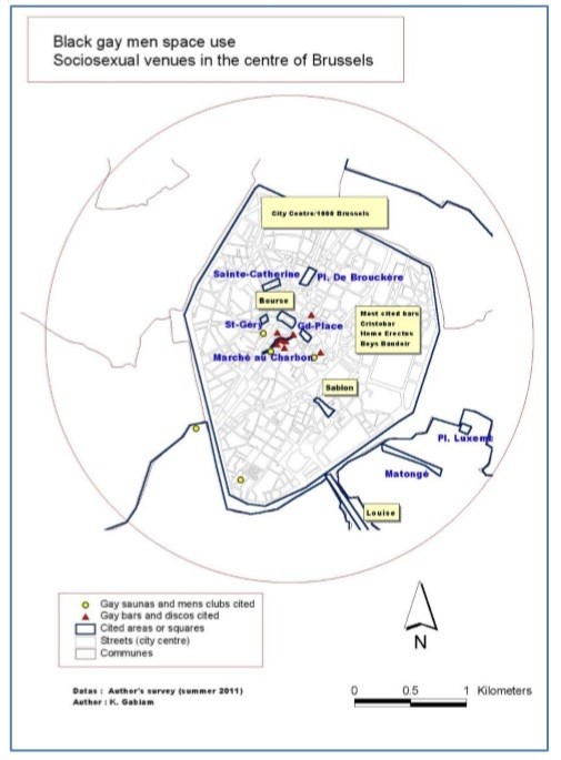 Les lieux de sortie les plus cités par les enquêtés sont trois bars situés dans le centre urbain (voir figure n°3). Il s’agit des bars suivants : Christo Bar, Homo Erectus et Boys Boudoir. L’un des propriétaires du Christo Bar est originaire d’Afrique subsaharienne. De ce fait, le bar a de plus en plus la réputation d’être le bar gay noir de la ville et attire des gays noirs de tout le pays surtout le week-end. Le bar Homo Erectus est très connu dans le milieu gay bruxellois depuis des décennies et plusieurs serveurs sont (gays) noirs. Le Boys Boudoir est une boîte gay friendly qui attire plutôt les gays noirs jeunes. Là, outre la musique, le facteur d’attraction pour certains gays noirs est le fait qu’on peut se faire passer pour hétérosexuel plus facilement que dans d’autres facilités commerciales gays.