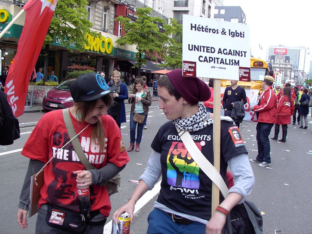 Zaterdag 18 mei: de jaarlijkse pride in Brussel. Ik loop samen met COMAC, (hier méér foto’s) de jongerenorganisatie van de PVDA. Mijn moeder hielp mee bordjes maken. Elke jaar is er wel een of andere droogkloot die een stukje tégen de Pride mag afscheiden. Dit jaar valt de eer te beurt aan VLD’er Lorin Parys, die intussen naar de NVA overstapte en daar allicht de anti-pridefractie kan vervoegen. Ondanks het feit dat het aantal deelnemers aan de pride jaar na jaar groeit, blijven mensen zich op een of andere manier afzetten tegen deze manifestatie en ze blijven dezelfde onzin reproduceren. De eerste die daar ooit aan begon is ene John De Wit, die in 1989 probeerde iedereen de schrik van zijn/haar leven te bezorgen met een tekst, die ik toen met het Roze Aktiefront al diende te weerleggen. Ik publiceer met plezier de openingsspeech van Chille Deman en Alan De Bruyne op de pride. çavaria deelde de dag voordien bloemen en ander leuks uit aan de stations.