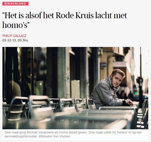 Vanackere meende zich te moeten uitlaten over het geven van bloed door homo’s. Dat mag niet van het Rode Kruis en daar hebben ze voorlopig groot gelijk in. Mannen die seks hebben met mannen (MSM) behoren tot de bevolkingsgroep die het zwaarst getroffen is door hiv (1 op de 20 is besmet) en dus het virus in het bloed heeft. (zie daarover mijn artikel: Alle homo’s aan de pil?). Om het heel cru uit te drukken: als je homo’s toelaat om bloed te geven kan je het evengoed rechtstreeks uit Afrika invoeren. Zo ernstig is het nu eenmaal met de besmettingsgraad van MSM. Het was even schrikken toen we op de website van De Morgen lazen: “Hij wil zo graag bloed geven. Maar hij mag niet. En dus loog Michiel Vanackere al drie keer over zijn geaardheid tegen het Rode Kruis.” Mensen aanzetten tot liegen is op zich al helemaal niet netjes. Bovendien zet hij zijn fans aan tot onbezonnenheid: als het niet erg is om bloed te geven want je denkt van jezelf dat je toch niet besmet bent, waarom zou je dan nog een condoom gebruiken?