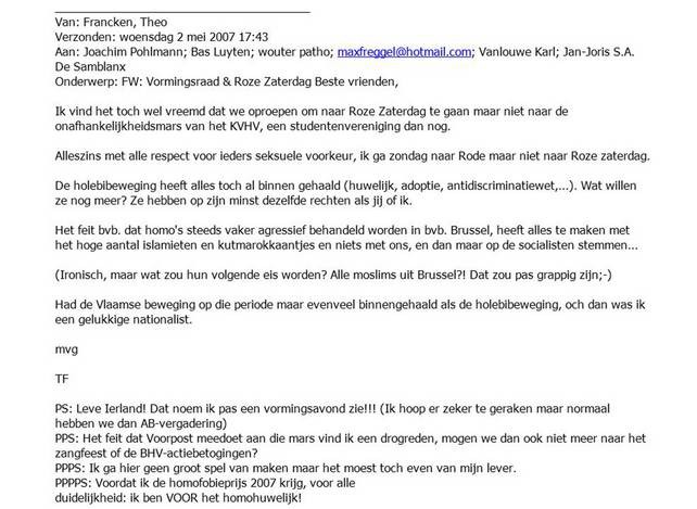 De Volt-provocaties in Borgerhout en Brussel (2012) passen perfect in de ideologie van de N-VA. Dat bleek onlangs nog toen een oude mail (2007) van Theo Francken opdook. Daarin schrijft Francken: “Het feit dat bvb. homo’s steeds vaker agressief behandeld worden in bvb. Brussel, heeft alles te maken met het hoge aantal islamieten en kut-marokkaantjes en niets met ons”. In diezelfde mail roept hij op om vooral niet naar de Pride in Brussel te gaan. Wie denkt dat het hier om een uitschuiver van een extremist gaat vergist zich. Hij vertolkt hier perfect de – vaak dubbelhartige – visie van de N-VA. Bart De Wever beweerde precies hetzelfde in Reyers Laat. De voorzitter veroordeelde de standpunten die in de mail van Francken staan ook niet. Hij maant hem enkel aan zijn racistische en homofobe standpunten wat minder uit te bazuinen: “Het is een goede les voor Theo Francken. Ik zeg al jaren dat hij moet oppassen met Facebook.” zegt De Wever in De Morgen.