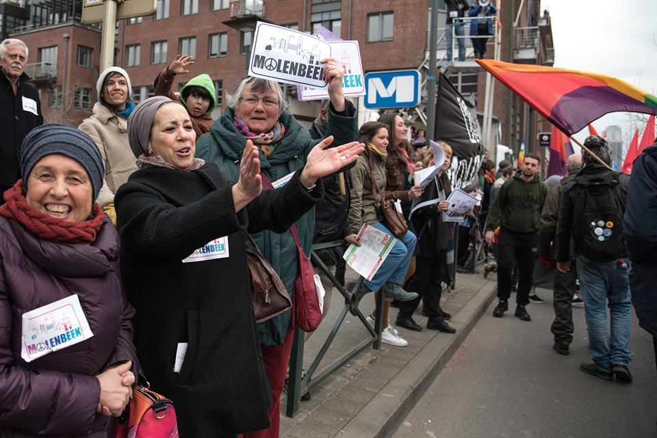 De parade kreeg ook een warm welkom in Molenbeek (zie ook het verslag op het RTBF-journaal) U weet wel: waar volgens Geert Bourgeois een ‘aparte samenleving’ zou bestaan en waar iedereen een terrorist is. Niks van gemerkt trouwens. Het was duidelijk een goed idee om de parade door Molenbeek (de beruchte kanaalzone) te laten passeren. Het valt telkens weer op dat je op manifestaties als deze een heel andere sfeer opsnuift dan in de media of in het discours van de meeste politici. Volgende keer moet je zeker eens meedoen dus!