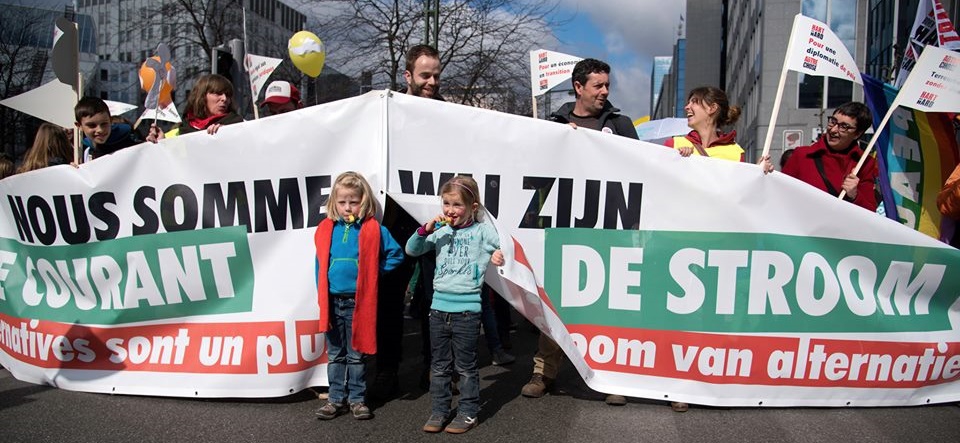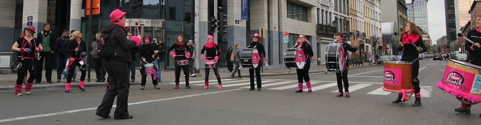 (Minstens?) 25.000 mensen stapten op in de Parade rond 5 krachtlijnen: Democratie is de som waarin iedereen meetelt – De nieuwe economie maken we samen We gaan voor een klimaat in evenwicht – We halen onze rijkdom uit straffe basisvoorzieningen – Onze toekomst stopt niet aan de grens. Çavaria liep mee achter de eerste krachtlijn. Er waren – naast de tientallen holebi’s die ik onderweg ergens ontmoette – ook nog twee georganiseerde vormen van aanwezigheid. Omnya, de Brusselse organisatie die rond vluchtelingen en allochtonen werkt had opgeroepen om met het blok “Onze toekomst stopt niet aan de grens” mee te lopen. Ook de rythm ladies van Famba (foto) waren er en op hun facebookgroep lieten ze weten: “Je vindt ons op de brug boven de autotunnel, hoek Boudewijnlaan en Antwerpse steenweg, bij de Vrouwenraad.”