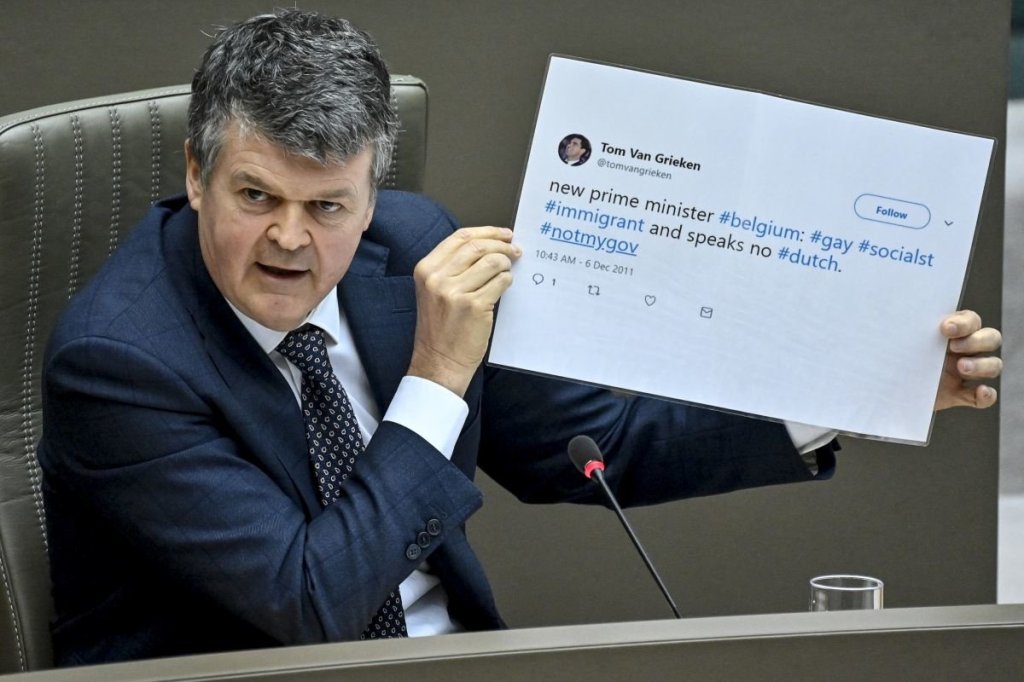 Tot grote ergernis van VB en N-VA haalde VLD-minister Bart Somers een pancarte boven: “De heer Van Rooy zwaait hier soms met plaatjes. Ik heb er ook eentje bij, eentje van de velen: niet van een tweede- of derderangsfiguur uit uw partij, maar van de heer Tom Van Grieken, uw partijvoorzitter. In 2011 zegt hij, op het moment dat Elio Di Rupo eerste minister wordt: ‘Dat is niet mijn regering, omdat hij een socialist is, geen Nederlands spreekt, een immigrant is, maar ook omdat hij gay is’. In het hoofd van uw partijvoorzitter kan iemand met een andere seksuele geaardheid dus geen eerste minister zijn.” Somers verwees ook naar een recente uitspraak van VB’ers: “Ik kan verder gaan. Ik kan de heer Bart Claes citeren op 7 oktober 2020: ‘Transgender Petra De Sutter is de verpersoonlijking van het cultuurmarxisme.”