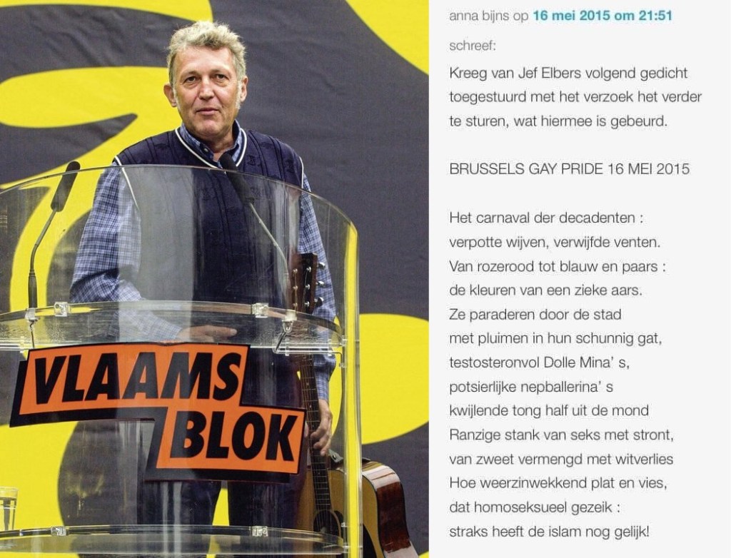 Waarom haalt het Vlaams Belang iemand van stal die dergelijke haat uitbraakt? En dan nog eens kort na een moord met een duidelijk homofoob motief? Vooreerst staat wat Elbers zegt met zoveel woorden in hun beginselverklaring. Verder is het aanvallen van de Pride – een van de grootste manifestaties voor LGBT+-rechten die elk jaar Brussel aandoet – een blijvertje bij het Vlaams Belang. Ze maken handig misbruik van het beeld dat nogal wat mensen over de Pride hebben als apolitiek decadent feestje. Terwijl het een massale bijeenkomst is waar de politieke eisen van de beweging jaarlijks krachtdadig gepresenteerd worden. Politiek gezien is de Pride een vuist die jaarlijks door niemand kan worden genegeerd.