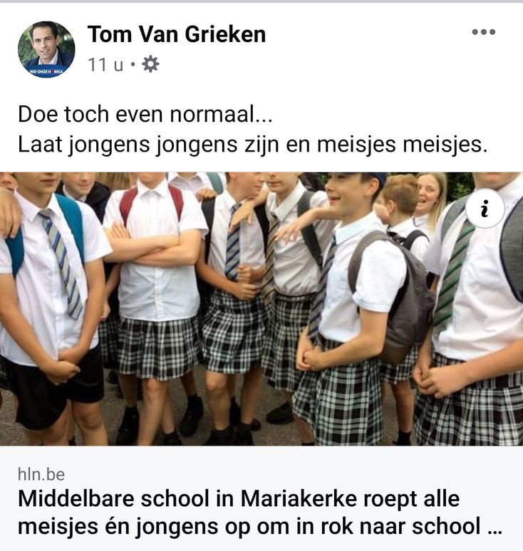 Uiteraard mag iedereen van mening zijn dat ‘mannen in een jurk’ niet normaal zijn. Het probleem daarbij is: als je dat als voorzitter van een partij blijft beweren er een moment gaat komen waarop je dat ook gaat verbieden. Daarvoor dienen partijen namelijk: om hun meningen in beleid om te zetten. En dat maakt dit soort ‘meningen‘ problematisch. Blijven we even bij de jurken. Een middelbare school in Mariakerke riep haar mannelijke leerlingen op om op een bepaalde schooldag in rok naar school te komen. “We vinden het belangrijk dat leerlingen zichzelf kunnen zijn, ongeacht hun gender, seksuele geaardheid of manier van kleden” legde Josefien de Backer (16), een van de leerlingen uit. Van Grieken reageerde afwijzend in een tweet: “Laat jongens jongens zijn en meisjes meisjes”.
