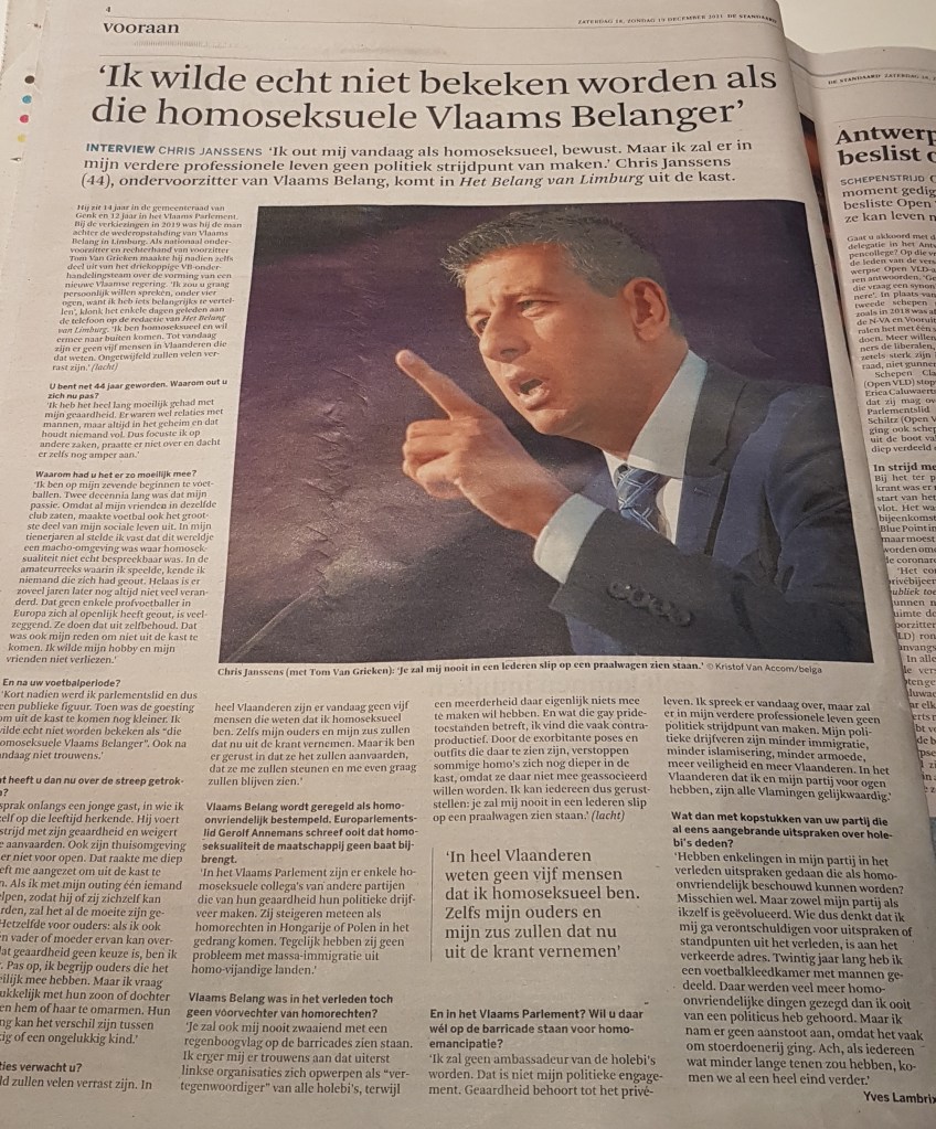 Janssens heeft het over uitspraken ‘in het verleden’. Nochtans gaat het over recente uitspraken van belangrijke collega’s die vandaag zéér actief zijn en waarvan er enkele tot de nieuwe generatie Vlaams Belangers behoren. Zoals Vlaams parlementslid Dominiek Sneppe, die het ‘een brug te ver vindt’ dat holebi’s kunnen trouwen en kinderen krijgen. Er is ook het aanstormende nieuwe talent Filip Brusselmans die transgenders een afwijking vindt en zich kant tegen het homohuwelijk. “Zeker zeven parlementsleden blijken het niet zo te hebben voor holebi’s”, kopte Het Laatste Nieuws in juni 2019 en noemde naast de reeds geciteerde verkozenen ook nog Wim Verheyen, Filip De Man, Wouter Vermeersch, Ortwin Depoortere en Immanuel De Reuse.