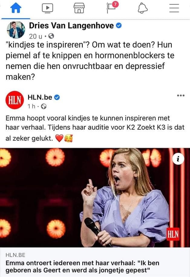 Vlaams Belangers blijken zich ook meer te gaan toeleggen op het transgenderthema. Het wordt duidelijk dat je met aanvallen op homo’s en lesbiennes toch niet meer zo goed kunt scoren en dus wordt dit onderwerp – dat vaak nog een stuk moeilijker ligt bij het publiek – aangepakt. Vooral Dries Van Langenhove beheerst deze aanpak intussen goed. Van straffe uitspraken over de geslachtsverandering van Bo Van Spilbeeck tot de bloederige details van een geslachtsverandering. In een facebookbericht reageerde Dries op een van de transgenderkandidates in de wedstrijd K2 zoekt K3: “Emma hoopt vooral kindjes te kunnen inspireren met haar verhaal”, schreef Het Laatste Nieuws. Waarop Dries reageerde: “Om wat te doen? Hun piemel af te knippen en hormonenblockers te nemen die hen onvruchtbaar en depressief maken?”
