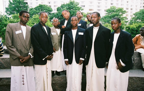 De gasten kwamen aan in hun tradtionele ceremoniekleding. ‘Kanzus’ voor de mannen: een hemd tot aan de enkels, zoals een jurk, met daarover een jasje, geplooid ter hoogte van de taille. De kledij laat discreet de enkels vrij en laat de mannen toe om zonder hinder te kunnen lopen. De duurste zijn in zijde. De vrouwen dragen ‘gomesis’, een ander zeer traditioneel Oegandees kledingstuk.