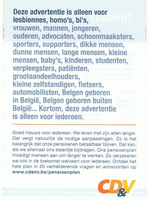 De meest opvallende is die van de CD&V. “Deze advertentie is alleen voor…” wordt gevolgd door een aantal groepen burgers in dit land: lesbiennes, homo’s, bi’s… Transseksuelen passen blijkbaar nog niet in het rijtje maar we weten al lang dat de tjeven wat langer nodig hebben om aan nieuwigheden in de beweging te wennen.